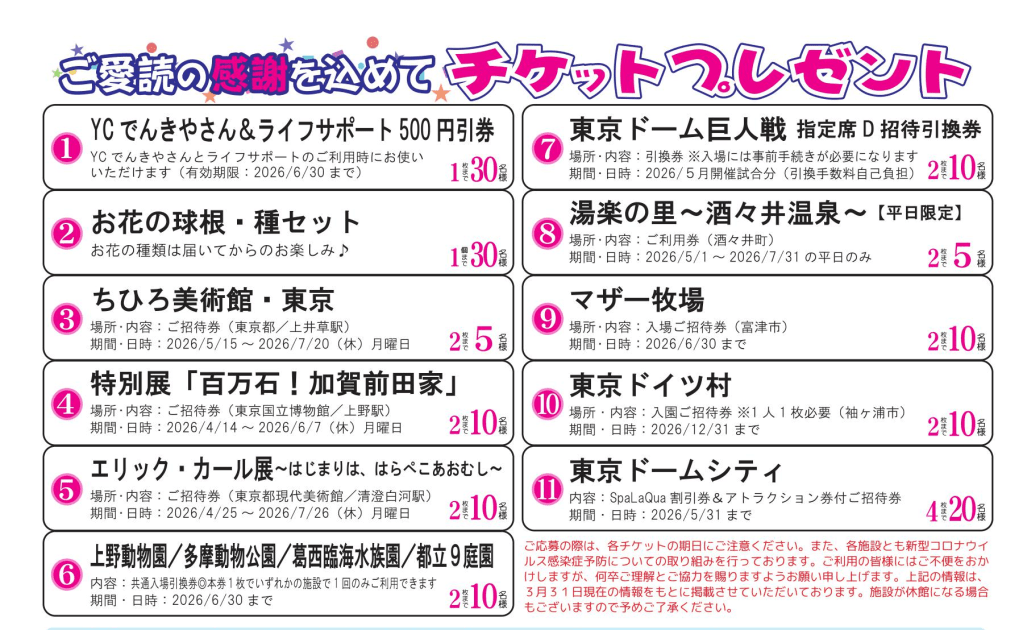 チケットプレゼント 固定ページ一覧 注意事項 ●ご応募はYC東金中央・東金東部のエリア内のお客様に限らせていただきます。●公平を期するため、1家族につきご購読紙のプレゼントについて、1度のみとさせていただきます。 【応募締切】 4/18(土) ← 戻るご回答をありがとうございました。 ✨ フリガナ(必須) お名前(必須) 住所(必須) 電話番号(必須) Eメールアドレス (必須) 年齢 チケットプレゼント <第一希望番号> チケットプレゼント <第二希望番号> チケットプレゼント <第三希望番号> お便り 送信フォームを送信しています Δ 共有: X で共有 (新しいウィンドウで開きます) X Facebook で共有 (新しいウィンドウで開きます) Facebook いいね 読み込み中…